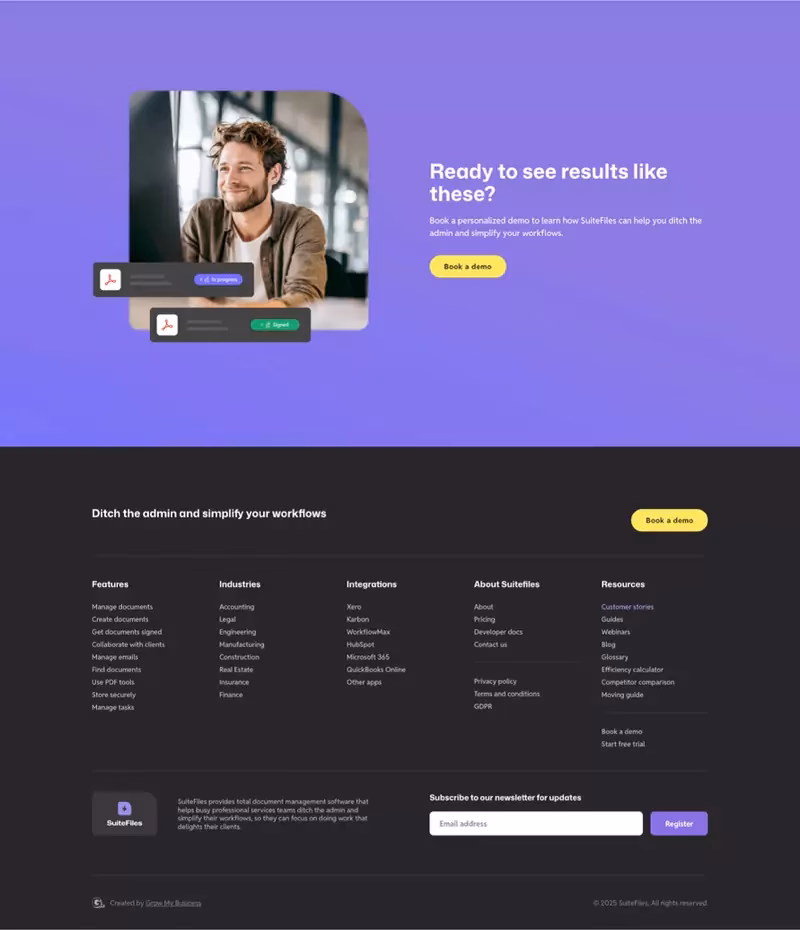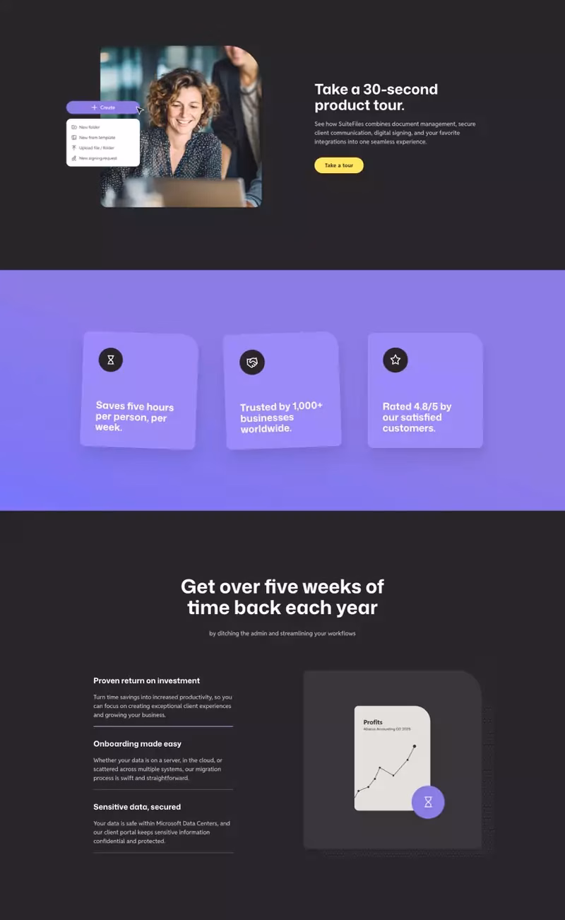 Working alongside the fabulous Noush Isaac (Head of Marketing, SuiteFiles), we flipped the site’s focus from inward-looking features to outward-facing benefits and outcomes.